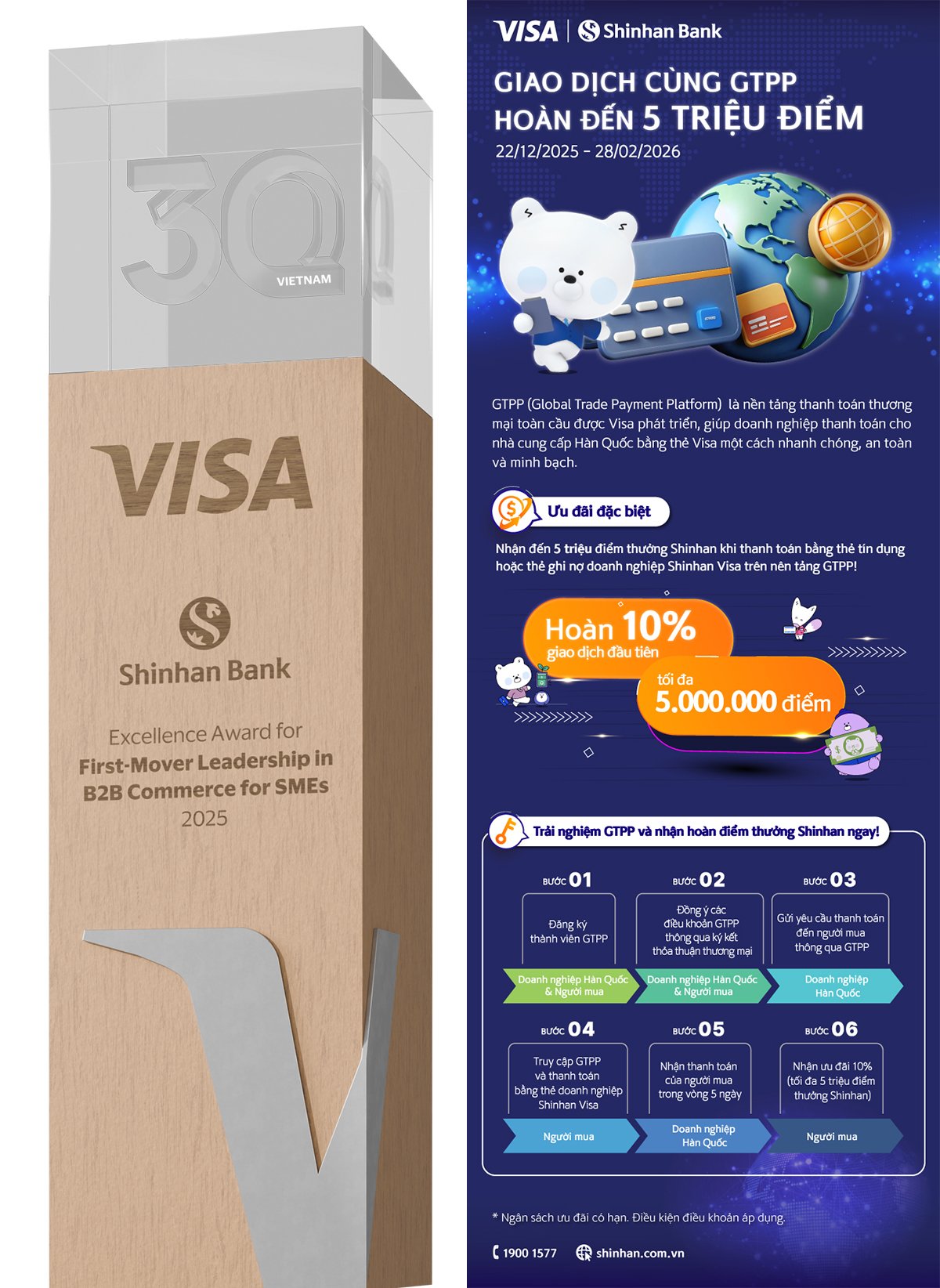 “Chúng tôi hiểu rằng thanh toán quốc tế là điểm nghẽn lớn nhất trong chuỗi giao thương, vì vậy giải pháp VPBiz Visa Platinum kết hợp GTPP được thiết kế để tháo gỡ những nút thắt quan trọng với quy trình thanh toán chỉ mất khoảng hai phút, hạn mức tín dụng linh hoạt, thời gian ân hạn kéo dài. Điều này giúp doanh nghiệp tối ưu dòng tiền, giảm chi phí vốn và nâng cao năng lực cạnh tranh trong chuỗi cung ứng Việt – Hàn,” đại diện VPBank nhấn mạnh.